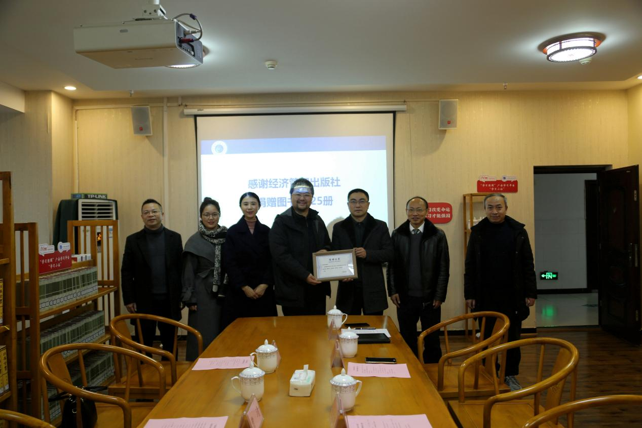 杨建华、白文春分别对经济管理出版社给予的惠赠表示感谢;学校将充分利用好这批图书为师生服务,不断丰富馆藏资源;同时希望双方在信息资源、图书出版、民主党派建设等方面加强合作交流。