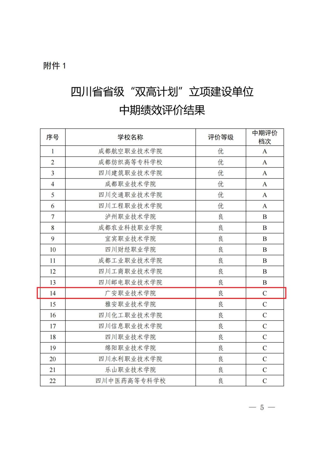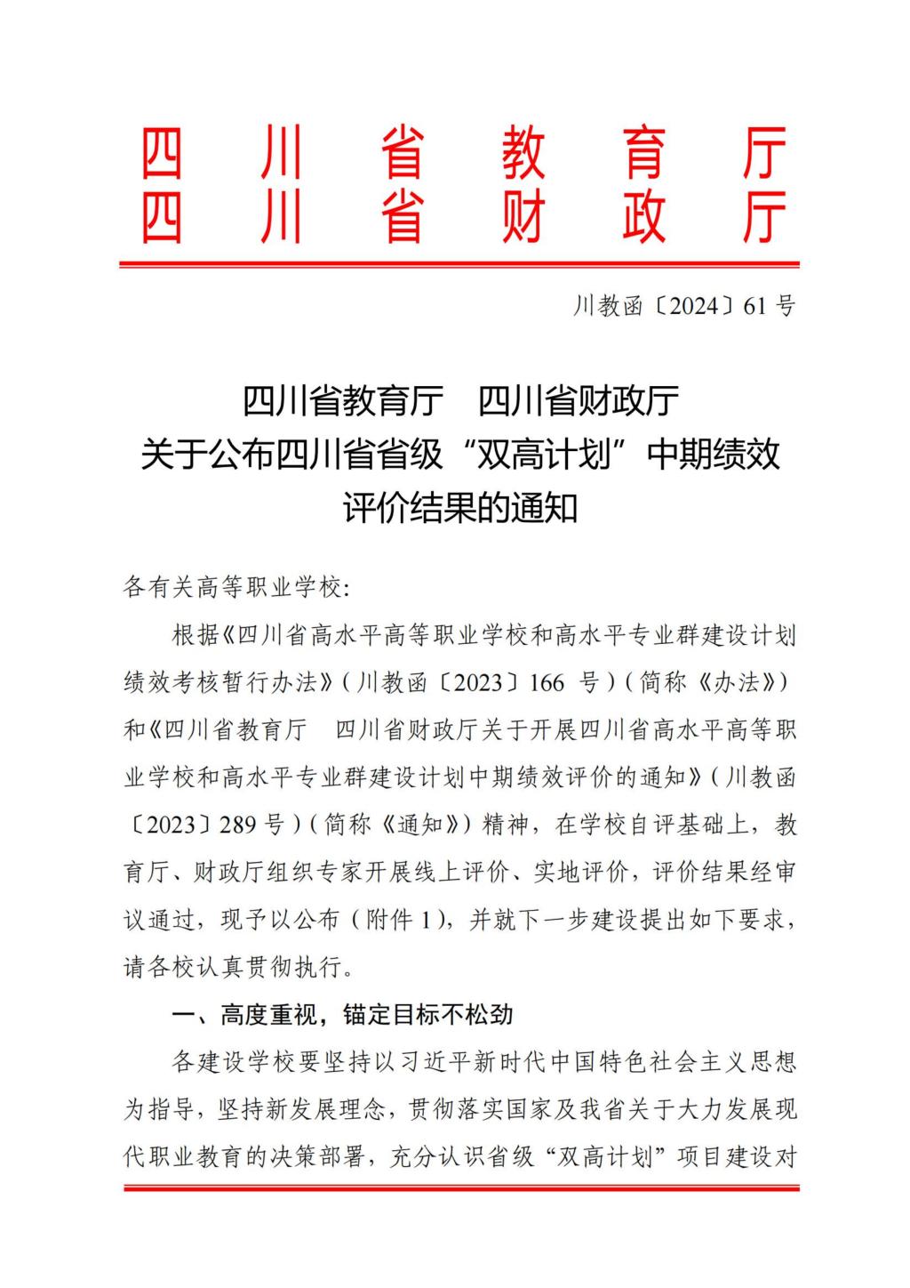 2024年1月26日,四川省教育厅 四川省财政厅发布了《关于公布四川省省级“双高计划”中期绩效评价结果的通知》(川教函〔2024〕61号),bv伟德国际1946省级“双高计划”中期绩效评价等级为“良”,排位由立项时的第20名跃升至第14名,成为C档第1,这是对学校“双高计划”建设成效的高度肯定,也彰显学校教育教学水平在实施“双高计划”建设以来正不断提升。