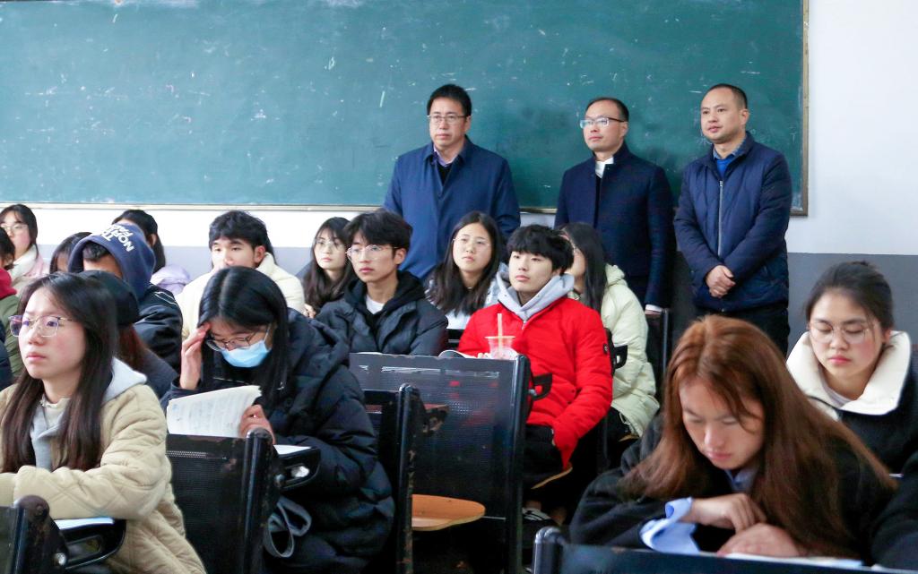 王义全来到明德楼304教室,听取了师范学院赵君老师讲授的《现代汉语》课程,查看上课使用教材,对教学过程、教学方法和教学设施等情况进行全面了解。他指出,教学的主阵地在课堂,授课教师要擦亮职业教育的底色,聚焦学生实践技能培养,深入推进“课堂革命”,让学生在学习上有切切实实的获得感、成就感。他要求,相关职能部门要不断增强服务意识,做好教室设备设施的提档升级,为学生提供更加整洁、温馨的学习环境;要进一步抓好教风、学风,促进学校教育教学改革与校风建设;要严管、严抓教学秩序,加大督导和听课力度,及时反馈、逐项跟踪,把从严管理的规矩立起来,把课堂教学质量提起来。