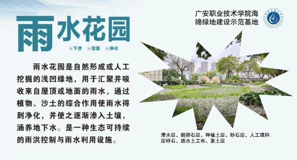 为深入贯彻习近平生态文明思想和“节水优先、空间均衡、系统治理、两手发力”新时期治水思路,积极推动节水型校园建设,学校争取海绵城市建设专项资金647万元,与广安发展建设集团合作完成节水型社会项目,完成小平广场、春晖楼门前广场、学生食堂门前广场铺装、绿化、管网综合改造,建设海绵城市40000余平方米,设有集水设施,可调节雨水流量,用于校内附近区域的绿化灌溉。