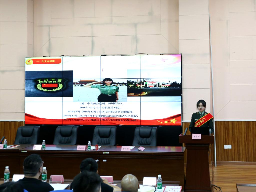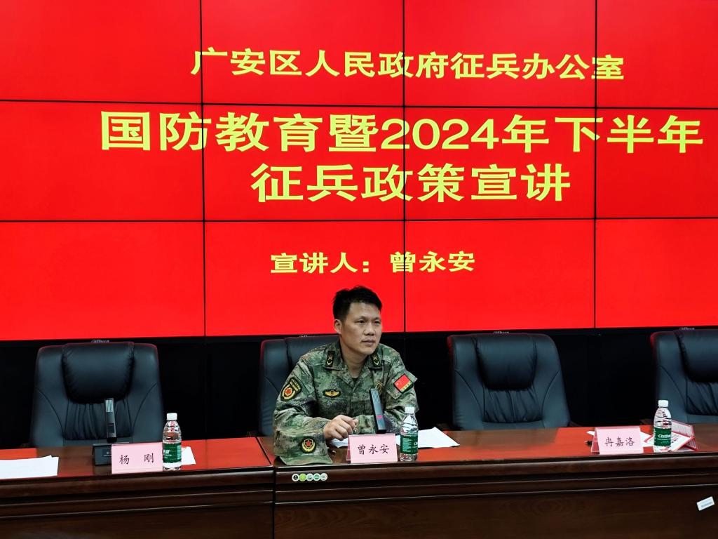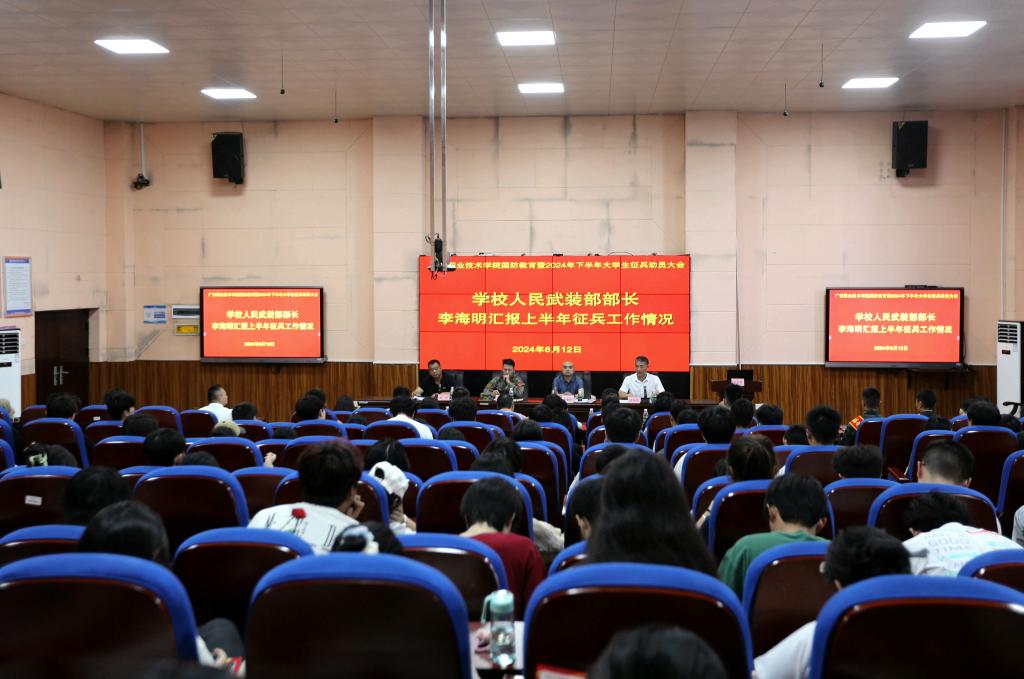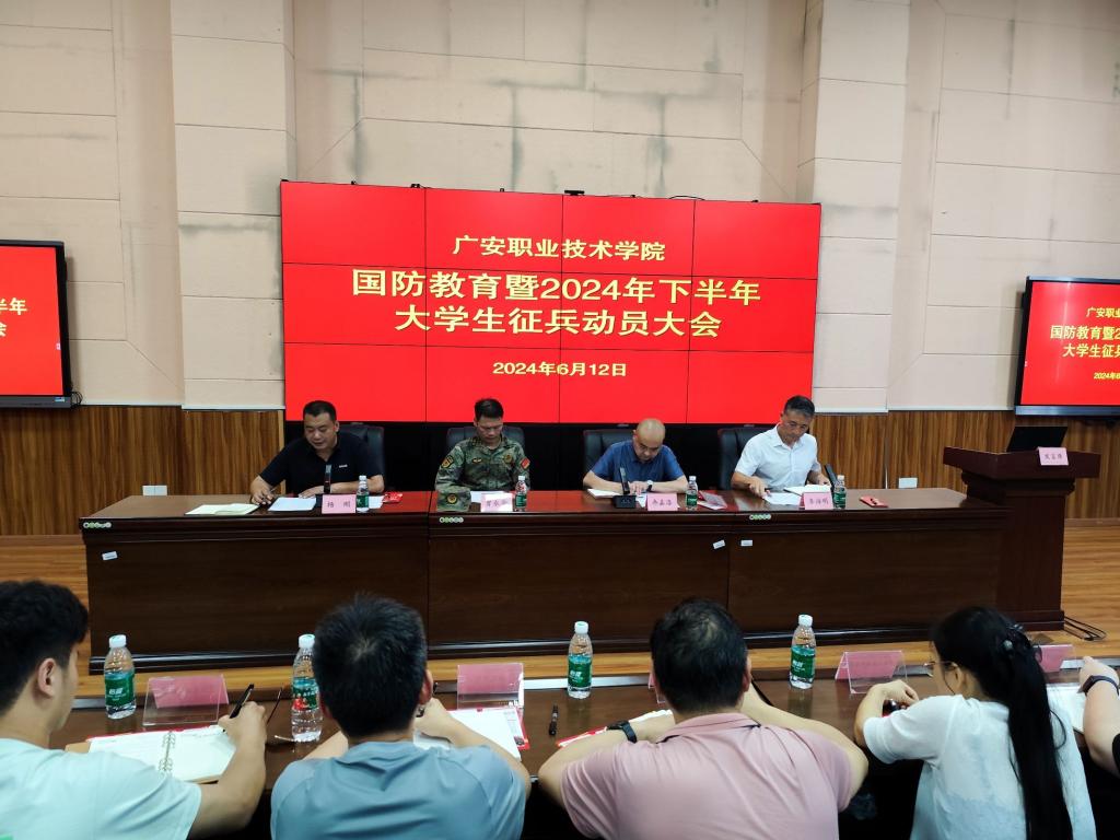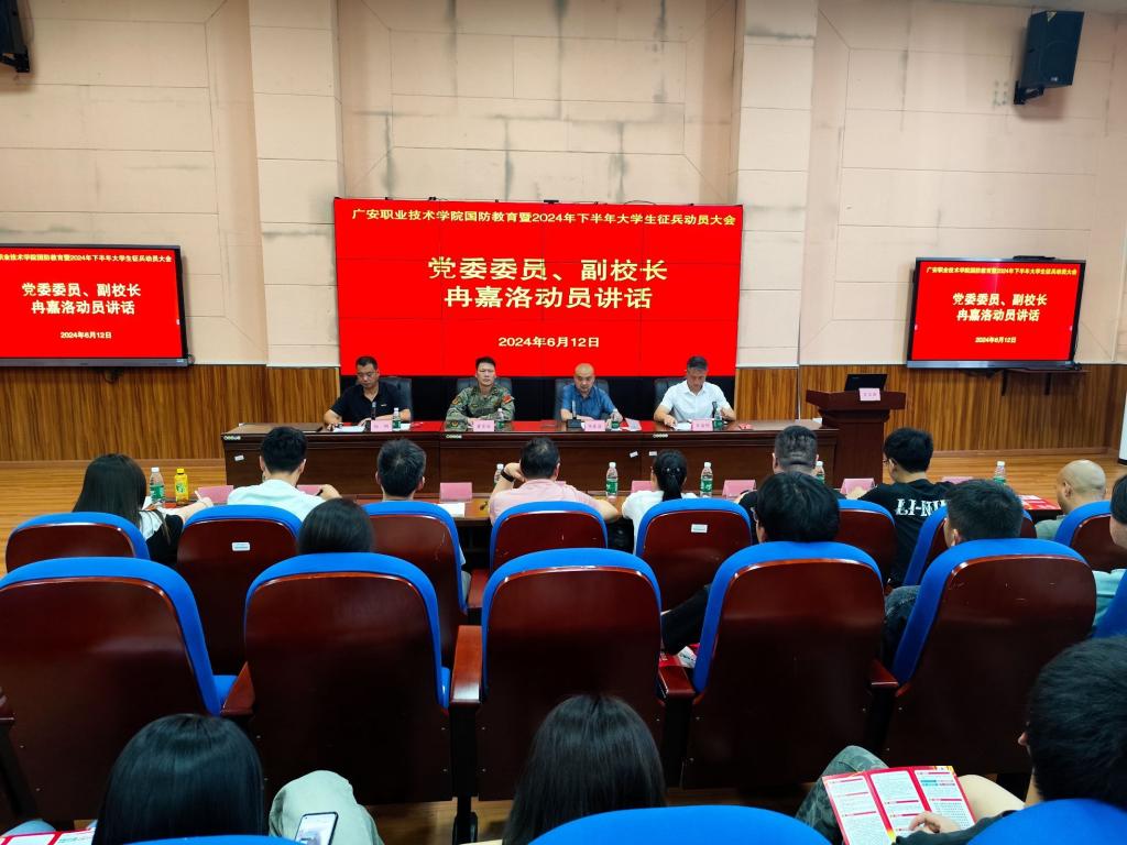 6月12日下午,学校在致用楼紫金厅召开国防教育暨2024年下半年征兵动员大会,学校党委委员、副校长冉嘉洛出席大会并作动员讲话,广安区人民武装部参谋曾永安与会进行征兵政策宣讲,会议由学校武装部副部长杨刚主持。