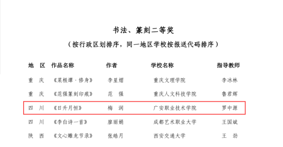 bv伟德国际1946斩获全国重大比赛二等奖1项 2024年6月,全国第七届大学生艺术展演活动在湖北省襄阳市举行,伟德学生作品《日升月恒》获书法、篆刻类二等奖1项,该作品由艺术学院罗中源老师指导,师范学院21级小学教育专业学生梅润创作。