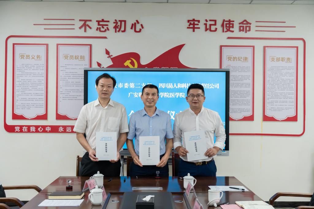 在与会领导和嘉宾共贺政校企合作圆满成功的祝福声中,民建广安市委会第二支部、四川易人和科技有限公司、bv伟德国际1946医学院三方愉快郑重签约,会后与会领导及嘉宾合影留念。