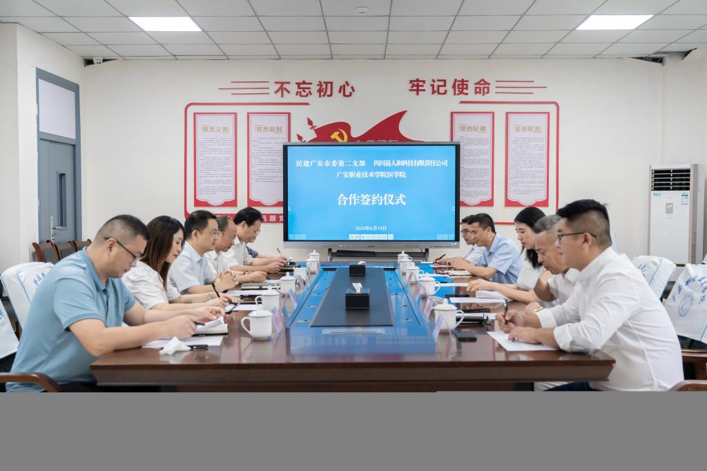 2024年6月19日下午,民建广安市委会第二支部、四川易人和科技有限公司、bv伟德国际1946医学院校企合作签字仪式在bv伟德国际1946奎阁校区明辉楼118会议室隆重举行。民建广安市委会副主委、市财政局副局长缪宇,民建广安市委会秘书长谭钠,bv伟德国际1946党委副书记陈鹏,bv伟德国际1946党委委员、统战部部长、工会主席杨建华,民建广安市委会第二支部主委刘德贵、副主委王德林,医学院院长杨书琴、医学院党总支书记喻忠,四川易人和科技有限公司董事长罗中华等领导和民建会员代表、企业代表、师生代表参加了仪式。