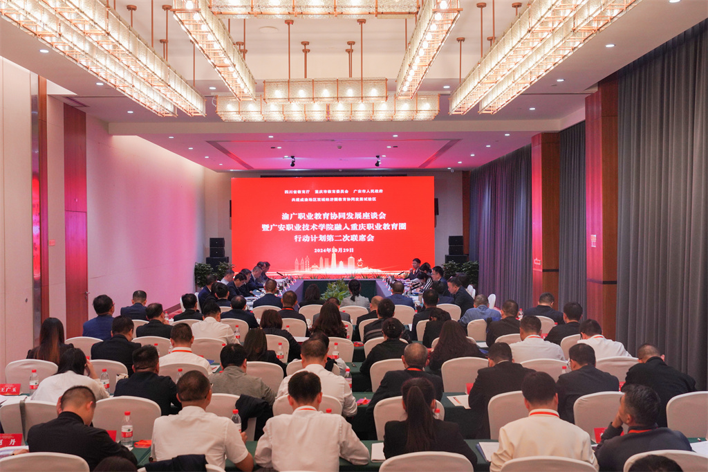 10月29日下午,学校举行渝广职业教育协同发展座谈会暨“广职融圈”行动计划第二次联席会。四川省委教育工委委员,教育厅党组成员、副厅长石静,重庆市委教育工委委员、市教委副主任李劲渝,广安市人民政府副市长陈麒巍出席会议并讲话,学校党委书记王冬霞致辞,会议由广安市委教育工委书记,市教育和体育局党组书记、局长张建超主持。
