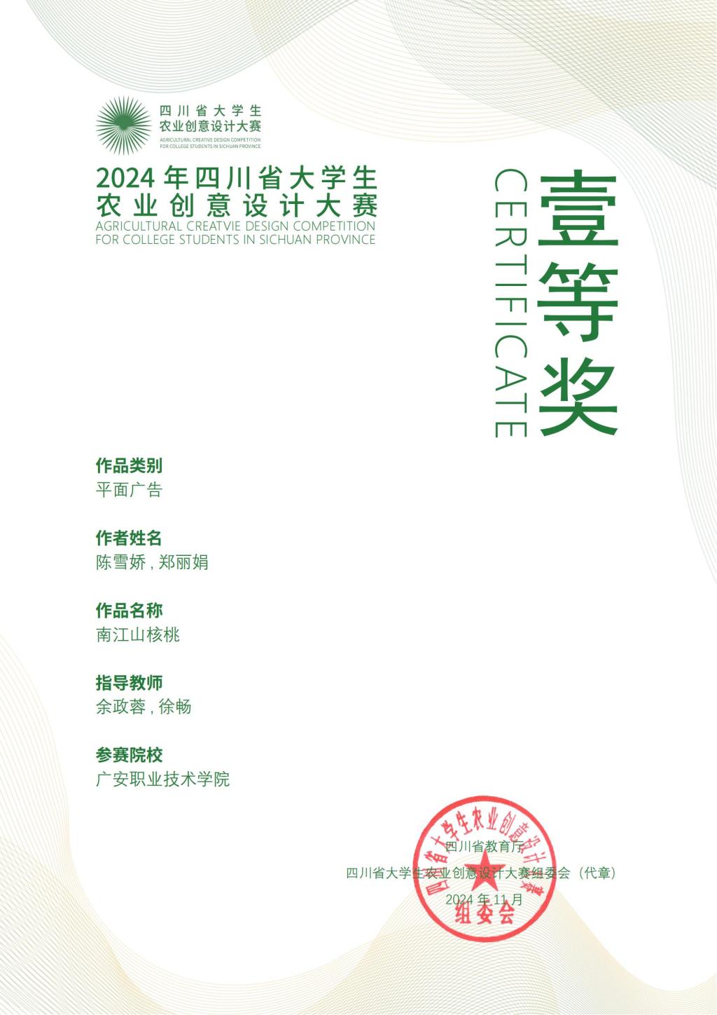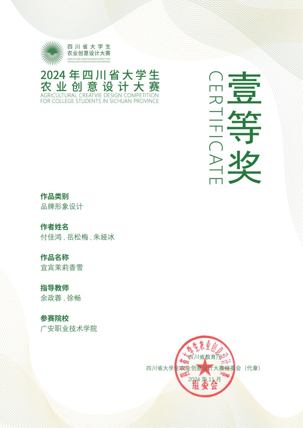 近日,由四川省教育厅主办四川农业大学承办的2024年四川省大学生农业创意设计大赛落下帷幕,伟德学生凭借出色的创意与专业技能在众多参赛者中脱颖而出。学校广告艺术设计专业、动漫制作技术专业学生积极备赛、踊跃参与,在此次大赛中载誉而归,共荣获一等奖6项、二等奖24项、三等奖30项。