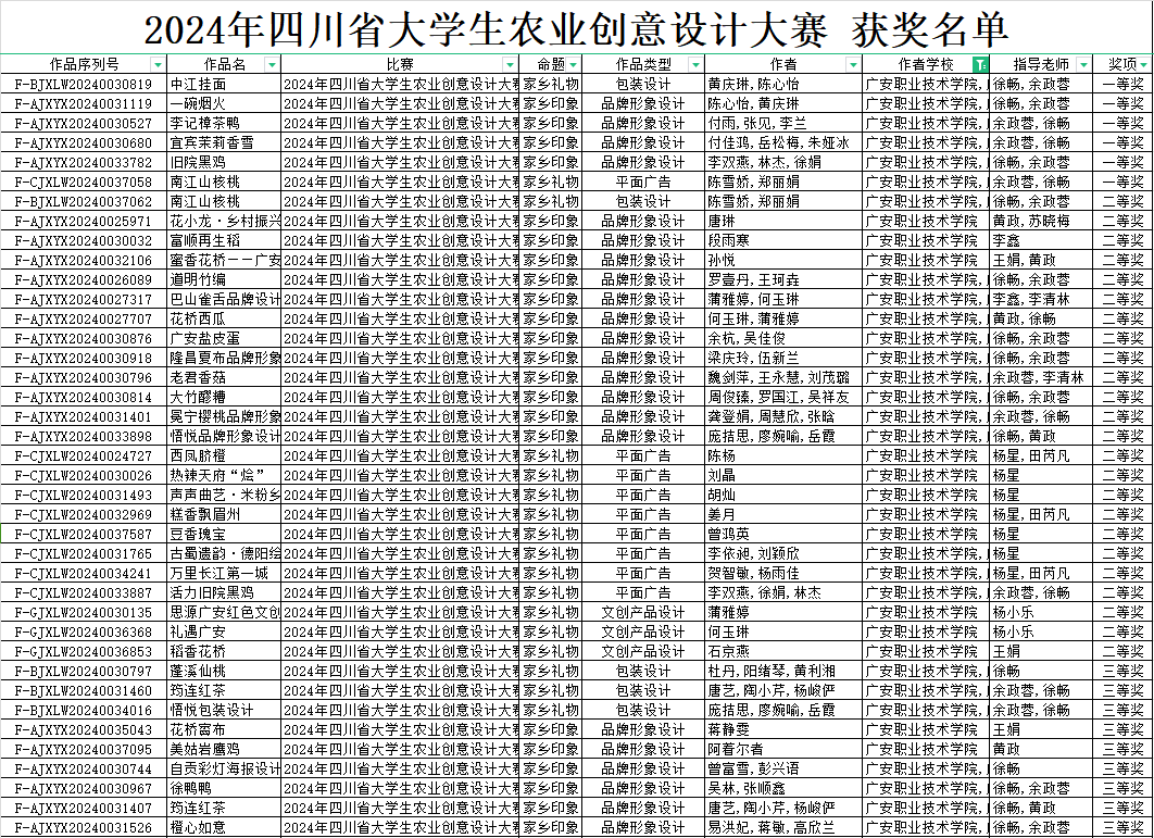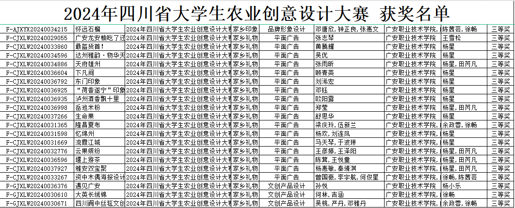 据悉,本次大赛规模空前,共收到来自全省各地高校的参赛作品14813件,经严格评审与筛选,最终评选出获奖作品8510件。我院学子以扎实的专业功底和新颖独特的创意视角,在本科、专科同赛的比拼中占得一席之地,充分彰显了我院相关专业的教育教学实力与人才培养成果,也充分展现出学子们响应国家政策,在乡村振兴领域的深刻认知、独到见解,以及出色的创新实践能力。未来学院将继续砥砺前行,助力学子在更多舞台绽放光彩。