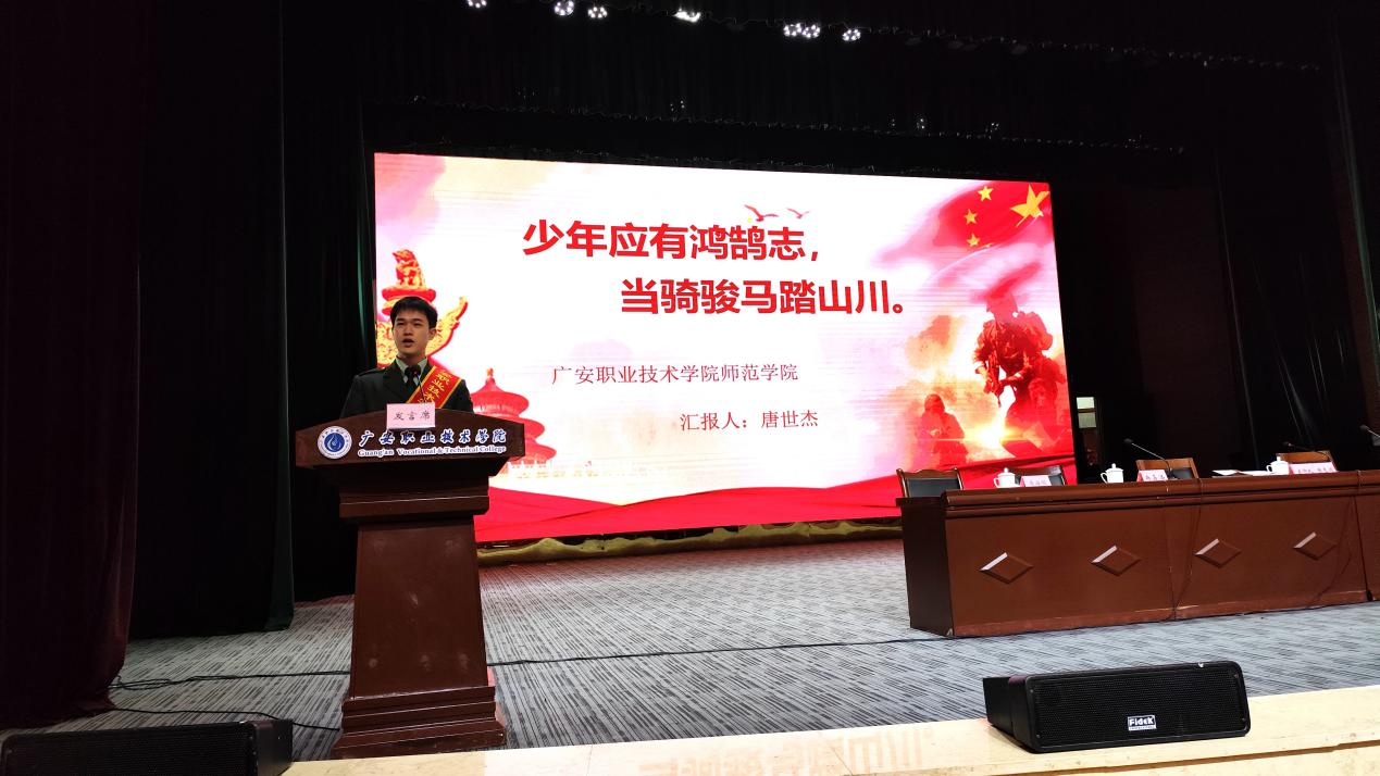 经济与旅游管理学院廖翰轩、艺术与设计学院莫晨曦、师范学院唐世杰3名退役复学学生代表,分别以《男儿何不带吴钩收取关山五十州》《携笔从戎青春的最荣誉》《少年应有鸿鹄志当骑骏马踏山川》为题,分享了自己在军旅生涯中的成长经历和军旅感悟,并呼吁同学们积极响应祖国号召,踊跃报名参军,为祖国国防事业贡献自己的力量。