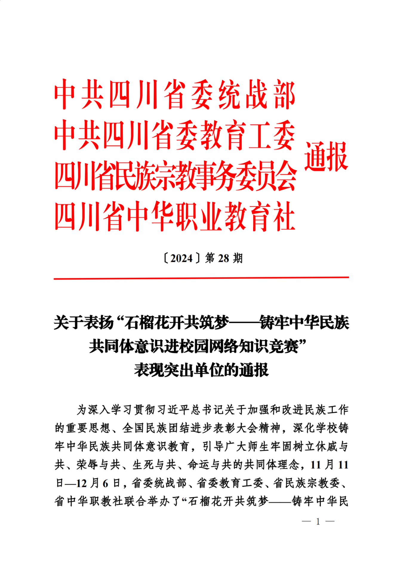 近日,中共四川省委统战部、中共四川省委教育工委、四川省民族宗教事务委员会、四川省中华职业教育社联合发布了《关于表扬“石榴花开共筑梦——铸牢中华民族共同体意识进校园网络知识竞赛”表现突出单位的通报》。全省共有30个学校和单位在此次竞赛中表现突出,荣获表彰,伟德是受表彰单位之一。