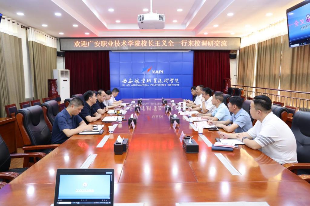 在西安航空职业技术学院,王义全一行与张敏华校长、郭红星副校长及相关二级学院和职能部门负责人举行了座谈交流会。双方围绕无人机应用技术专业产教融合、校企合作、实训建设、人才培养等方面展开深入探讨与交流。张敏华对王义全一行来校调研交流表示热烈欢迎,介绍了学校的发展历史、发展现状、办学成效与特色等方面;王义全对西安航空职业技术学院的热情接待表示感谢,并介绍bv伟德国际1946办学情况,表达了此次交流学习的目的与想法,同时,邀请相关领导到广安和学校指导工作与开展交流活动。双方一致同意签署合作协议,加强合作,开展多元交流活动。会前,王义全一行在郭红星陪同下参观了学校飞机维修工程中心、无人机实训基地。