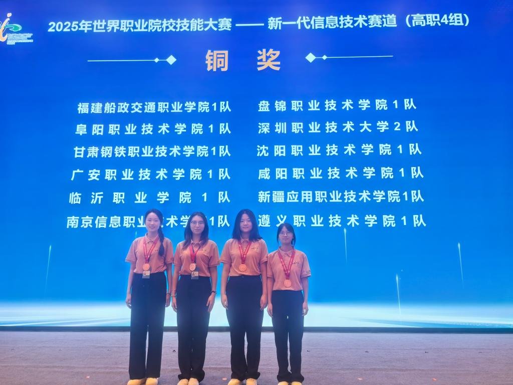 9月7日至12日,2025年世界职业院校技能大赛总决赛争夺赛新一代信息技术赛道在常州举行,比赛共6天,来自全国28个省(自治区、直辖市)的251支代表队、1800余人参赛。电子与信息工程学院学生周旋、冉斯怡、李拉娜、王高群组成的参赛团队,在王靖、张义桥两位老师的精心指导下,凭借实用的创新项目、精湛的技能操作、出色的专业素养、默契的团队协作,最终脱颖而出,荣获该赛项铜奖,实现了学院在该项赛事中的历史性突破。