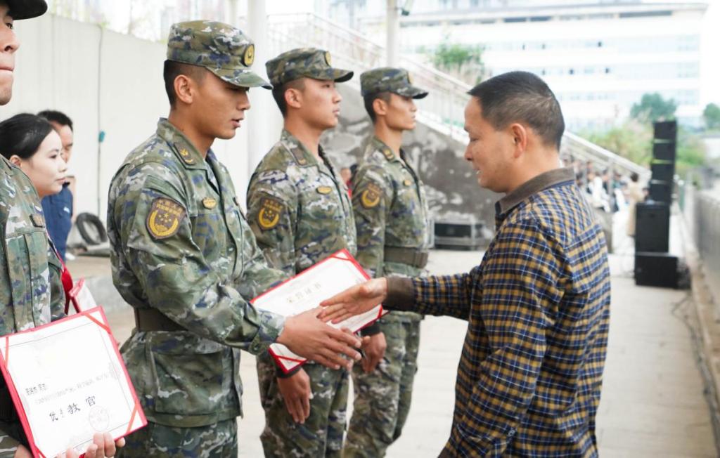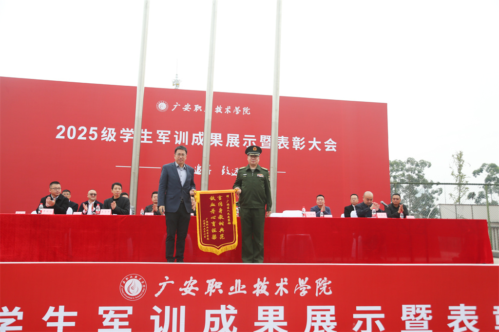 王义全、陈鹏代表学校党委、行政,向关心和支持学校军训的广安军分区、武警广安支队、广安区人民武装部表示衷心感谢,向为本次军训付出辛勤汗水的全体教官、老师们致以崇高敬意,向在军训中取得优异成绩的集体和个人表示热烈祝贺,并分别向广安区人民武装部、武警广安支队赠送了锦旗。