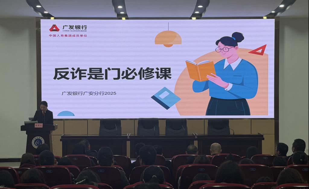 宣讲环节中,广发银行广安分行工作人员通过典型案例,生动讲解了电信网络诈骗的常见手法和防范措施,提醒同学们警惕陌生来电、虚假网络借贷等诈骗形式。