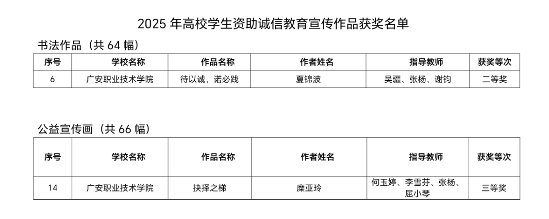 近日,四川省教育厅、中国人民银行四川省分行公布了2025年全省高校学生资助诚信教育宣传作品获奖名单,伟德荣获优秀组织奖,建筑工程学院工程造价专业2022级1班夏锦波创作的书法作品《待以诚,诺必践》荣获二等奖,师范学院小学教育专业2023级3班糜亚玲创作的公益宣传画《抉择之梯》荣获三等奖。