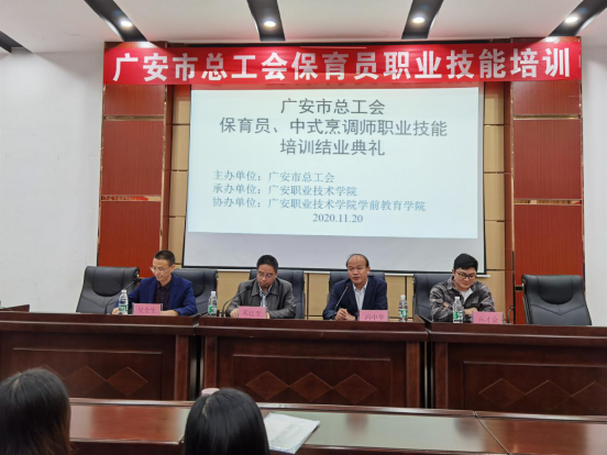 为提高技能型人才培养人才,增强广安市社区劳动者的就业能力和工作能力,广安市总工会在学校举办了为期12天的“保育员”和“中式烹调师”职业技能培训。11月20日上午,培训圆满结束,结业典礼在学校举行。广安市总工会党组书记、副主席冯中华,学校党委委员、副校长邓廷奎出席典礼并讲话。典礼由学前学院院长吴全生主持。