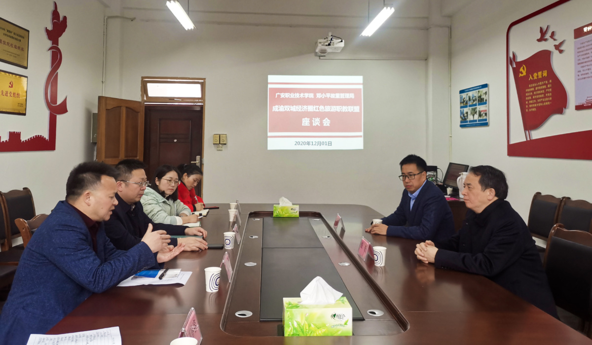 12月1日,学校在明德楼召开成渝双城经济圈红色旅游职教联盟座谈会。邓小平故里管理局党组书记、局长钱奇,学校党委副书记、校长王义全,校长助理李晓强应邀出席并指导工作。会议由经济管理学院院长文卫主持。