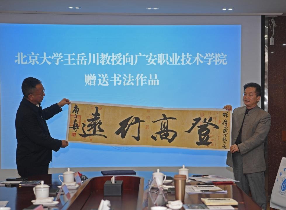 座谈会上,学校党委副书记、校长王义全介绍了学校建设发展情况及“王岳川国学书法工作室”规划情况;王岳川教授介绍了自己的成长历程,并就国学与书法的传承和传播等进行了分享交流。洪丽在讲话中指出,王岳川教授受聘为广安职院教授,能够提升学校办学水平,能推动广安在美育、国学与书法教育方面迈上新的台阶,希望学校进一步加强美育教育,培养具有审美修养的高素质技术技能人才。会上,王义全代表学校向王岳川教授颁发了特聘教授聘书,王岳川教授向学校赠送了书法作品。