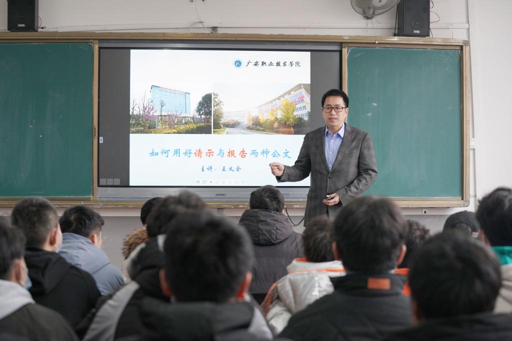 在教学过程中,王义全不仅向学生讲授了撰写公文的有关战略思想和战术方法,还传授了学生在今后的职场中为人处世的道理。他指出,撰写公文要做到“三好”“三懂”,即要想得好、写得好、用得好,懂业务、懂管理、懂领导。他叮嘱学生在学习专业知识技能的同时,也要掌握好公文写作这一管理工具,不断提高思维能力和认识能力,勉励学生在大学阶段要树立远大的理想和目标,“技术是你们的看家本领,公文是你们事业和人生成功的翅膀”。
