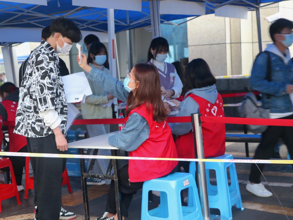 26日上午,学校在滨江校区北门和南门、奎阁校区搭建了若干条考生通道和校内师生进出专用通道,校门外设有临时隔离区,校内考试区域和本校师生活动区域用警戒线严格区分开。两个校区大门外均有特警和交警维护治安和疏导交通。26日下午和27日上午,考生经健康码检查、体温检测、通信行程卡查验、身份核查四个流程进校熟悉考场和参加考试。27日考生午餐由学校免费送至考场,监考教师和学生志愿者待考试结束后体温检测正常才能离开警戒区域,基本做到了考生和校内学生“零接触”。