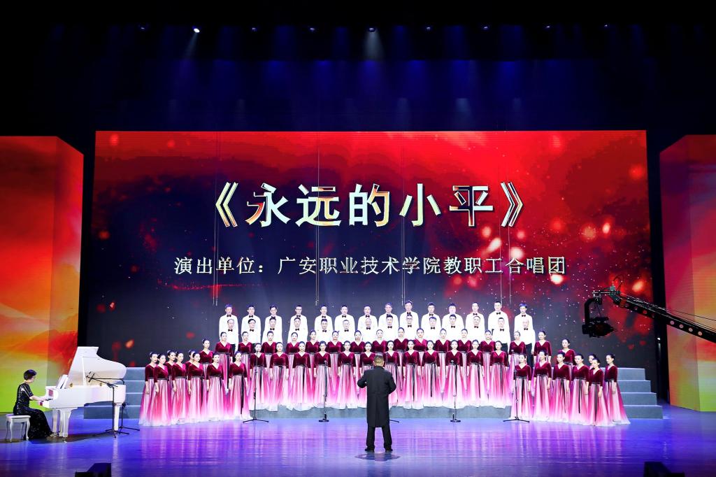 比赛现场,《祖国颂》《梦圆中国》等一首首振奋人心的爱党爱国主旋律歌曲在大厅回响,以歌声再回峥嵘岁月、忆苦思甜,以歌声赞美时代发展、星河斗转。“我们念着他,我们爱着他,中国的儿子邓小平….”学校教职工合唱团倾情演绎的《永远的小平》作为第五支参赛曲目,以朴实无华的歌词、深情动人的演唱,充分展现了伟人邓小平的形象,表达广安儿女对小平同志的深切怀念,赢得在场观众的阵阵掌声,逾500万线上观众共同观看了演出并纷纷点赞。