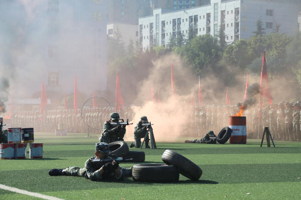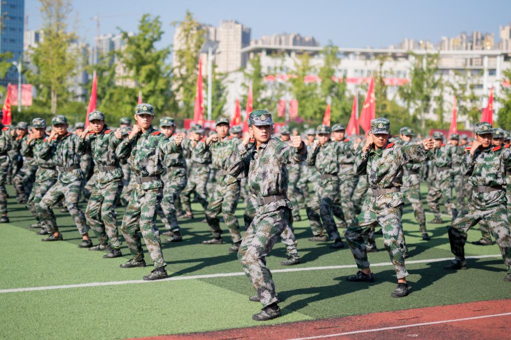 在庄严的国歌声中,五星红旗冉冉升起。各个分列式方队以高昂的士气、整齐的队列、响亮的口号依次走过主席台接受检阅。汇报表演中,手语操方队用律动的双手,悠扬的歌声传递爱的力量,表达了对国与家的热爱;三声三相方队呈现出整齐划一的步伐和铿锵有力的号声;刺杀术、擒敌拳方队眼神坚定、身形矫健、气势磅礴;战术表演体现了戎装在身,不畏艰辛、勇往直前的军人雄风。军训汇报充分展现了15天的训练成果,全面诠释了青年人的热血与担当。