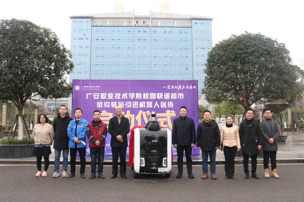 启动仪式上,校长助理李晓强和广安市邮政局局长刘毅一起为快递机器人“小蛮驴”揭幕,标志着校园机器人快递投送业务正式运行。广安快递物流生产性实训基地(即“校园快递超市”)是在广安市邮政管理局积极推动下,学院与市快递协会、市圆通、中通、申通等企业联合共建的校内产教融合基地。