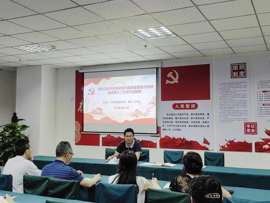 6月23日下午,机关二支部在思源楼209召开全体党员大会,学校党委副书记、校长王义全为全体党员同志宣讲习近平总书记来川视察重要指示精神和省第十二次党代会精神。