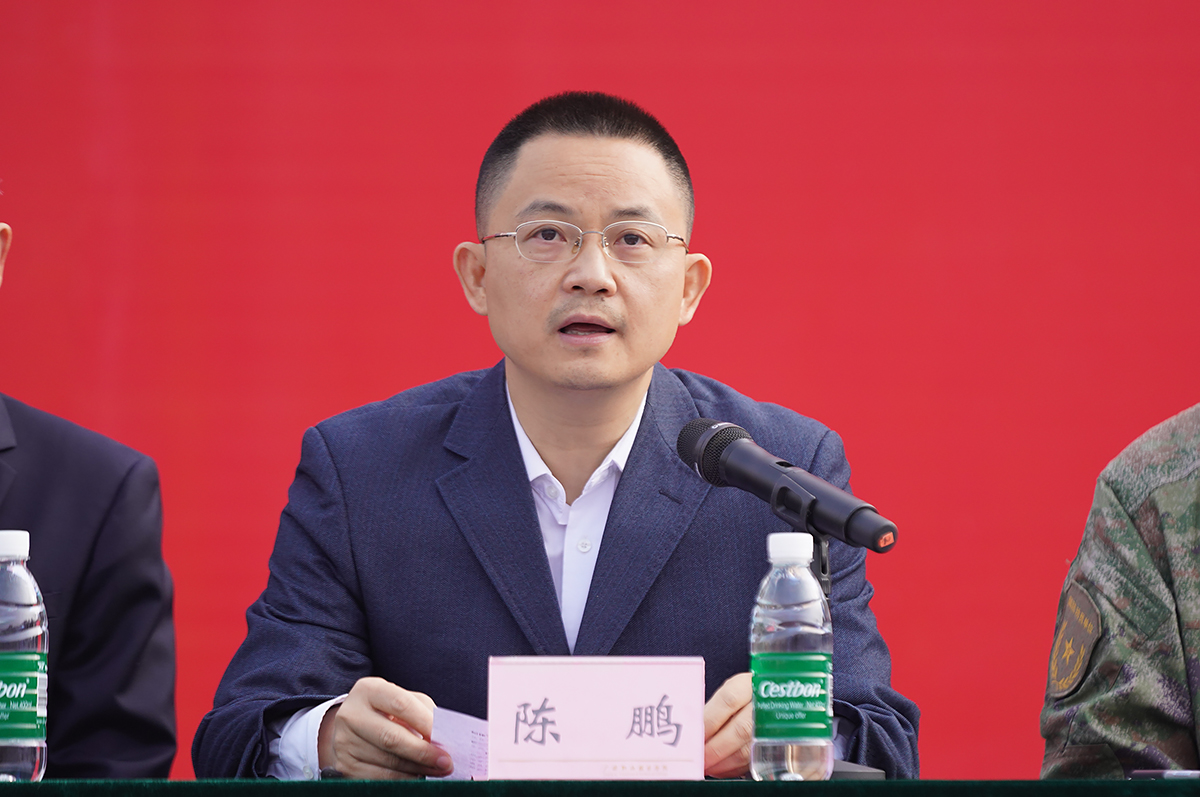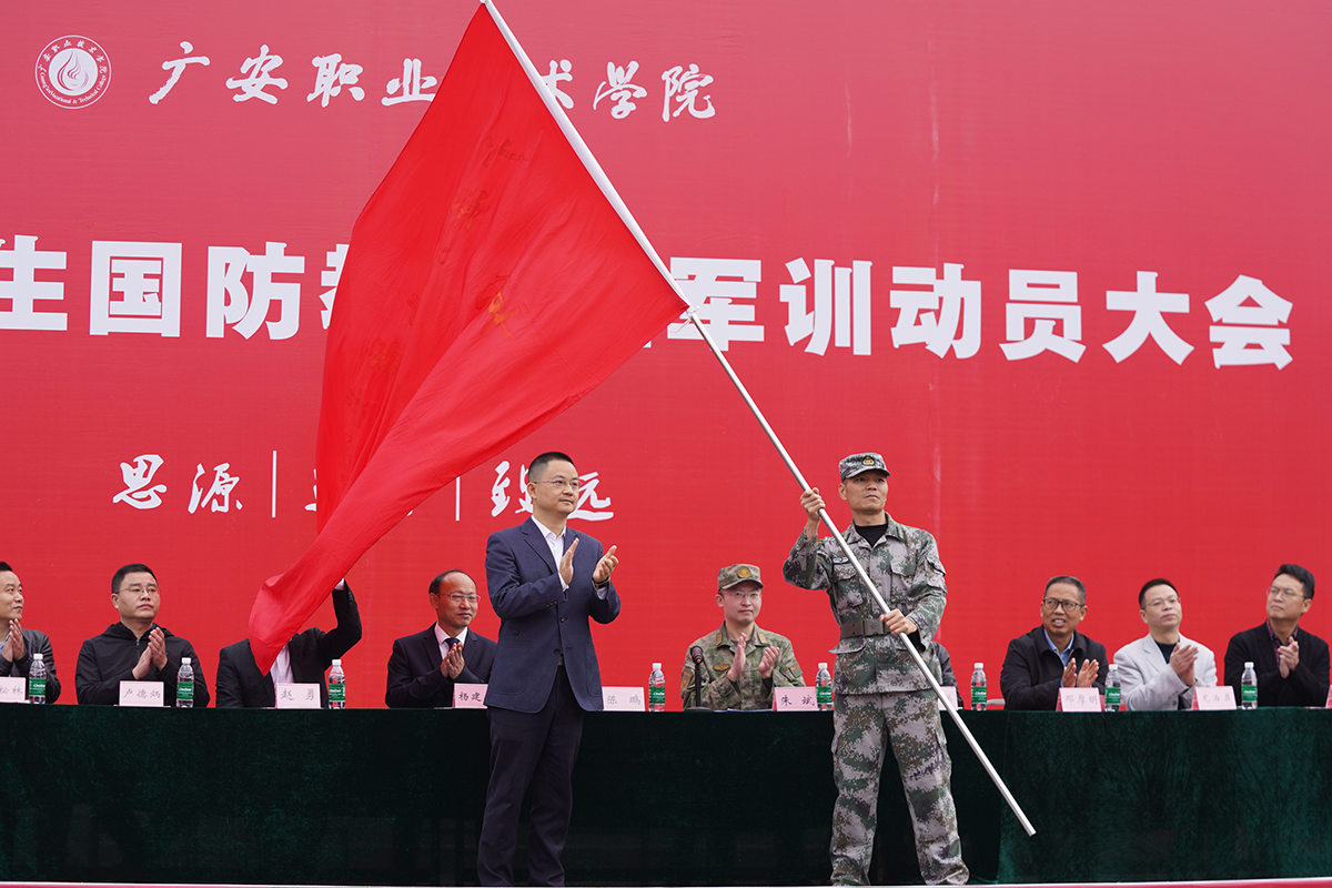 陈鹏代表学校向军训团进行了授旗,同时,他对全体参训学生提出了要求和希望,希望同学们树立正确的国防观念,在军训过程中,以“有灵魂、有本事、有血性、有品德”的新一代军人标准严格要求自己,发扬军人优良作风,遵守纪律、刻苦训练,掌握必要的军事技能,磨砺自己的意志品德,在军训中增长才干、收获成长,努力成为有抱负、有担当、有毅力、有体魄的青年学子。
