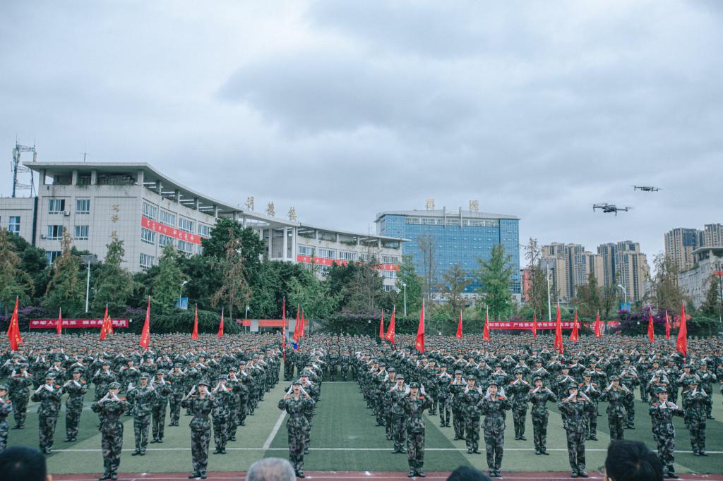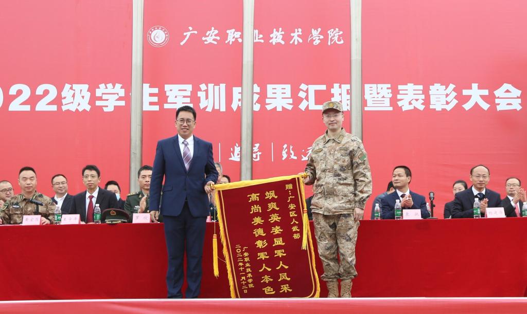 王义全代表学校向承担本次军训任务的广安区人武部赠送了锦旗,表达了师生们对官兵的感激之情。袁驰代表学校向2022级全体同学高质量完成军训任务表示祝贺,为同学们精彩表现点赞。同时提出三点希望与同学们共勉,一是希望同学们要永远信党爱党,做社会主义伟大事业的可靠接班人;二是希望同学们要勇担责任使命,做中华民族伟大复兴的奋进筑梦人;三是希望同学们要珍惜青春韶华,做德才兼备全面发展的时代青年人,切实做好人生规划,用好每一分每一秒,在三年里学有所获、学有所成。