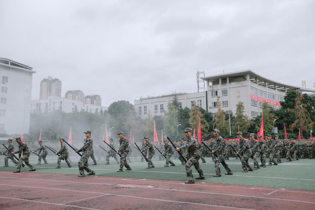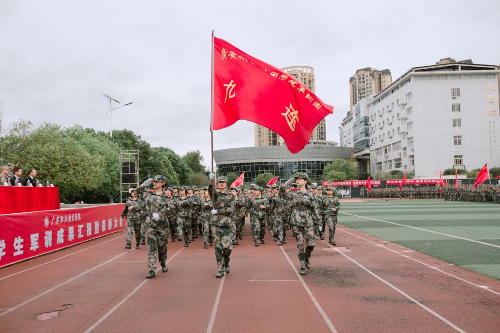 在庄严的升旗仪式后,分列式正式开始,各个方队以威武的军姿、高昂的士气、整齐的步伐依次走过主席台接受检阅。手语操方队用律动的双手,表达了对国与家的热爱;刺杀术、擒敌拳方队眼神坚定、身形矫健、气势磅礴;战术表演体现了戎装在身,不畏艰辛、勇往直前的军人担当。汇报表演中,广职学子充分展现了昂扬向上的精神意志和新时代青年学生的自信风采。