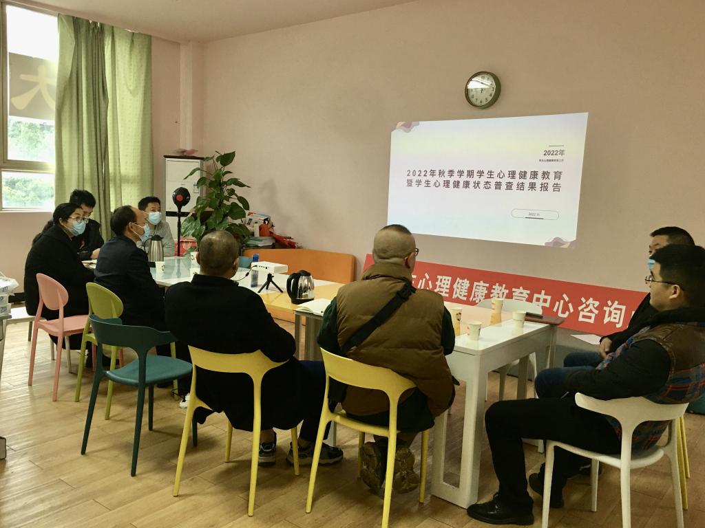 杨建华一行逐一查看了心理接待室、个体咨询室、沙盘治疗室等功能室,详细了解了中心的日常工作,听取了由中心专职教师阮恒所作的《2022年秋季学期学生心理健康普查结果报告》。杨建华强调,要高度重视问题学生的心理工作,压实压紧领导干部的责任,建立分级分片、责任包干的工作机制,加强辅导员心理工作意识的培养以及工作技能的培训,进一步完善大学生心理健康教育中心的建设,努力预防学生因心理问题引发极端事件,切实维护学生生命健康安全和校园稳定。