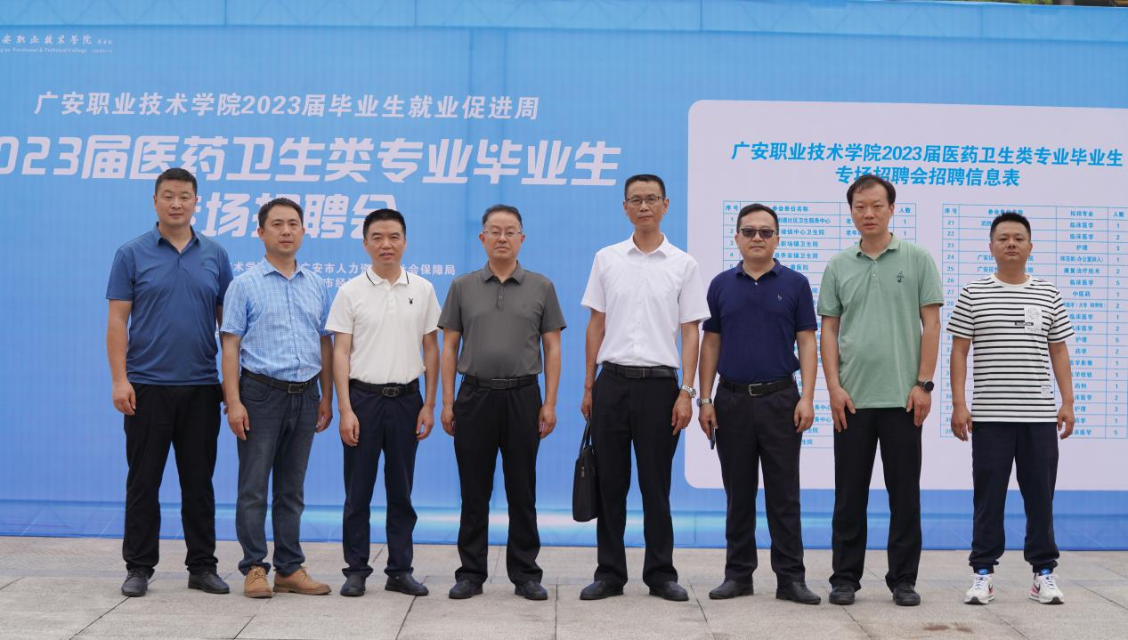 招聘会过程中,广安市卫健委副主任鲁鹏程,学校党委委员、副校长袁祖洪等领导一行来到招聘会现场,亲切关心学生的应聘情况。领导们充分肯定了医学院的就业工作,并向前来面试的同学们提出“就业要面向基层,面向广安,要有为伟人家乡人民服务的就业愿景与家国情怀。”
