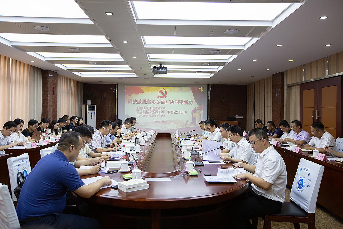 为庆祝中国共产党成立102周年,追寻中国社会主义改革开放和现代化建设的总设计师邓小平同志的青年足迹,牢牢把握主题教育“学思想、强党性、重实践、建新功”总要求,推动成渝地区双城经济圈教育协同发展试验区建设走深走实,7月11日,重庆市教委秘书处党支部、发展规划处党支部、广安市教育和体育局机关党支部与学校机关二支部联合开展“同城融圈连党心,渝广协同建新功”党建活动。重庆市教委一级巡视员邓睿出席活动并讲话。重庆市委教育工作领导小组秘书组秘书处处长罗胜奇,广安市委教育工委书记、市教育体育局党组书记、局长黎均平,学校党委副书记、校长王义全参加活动。活动由重庆市教委发展规划处党支部书记、处长唐樵主持。