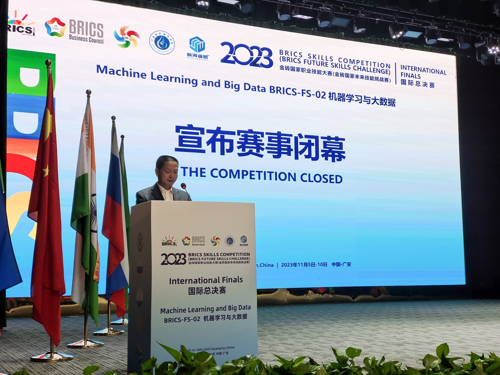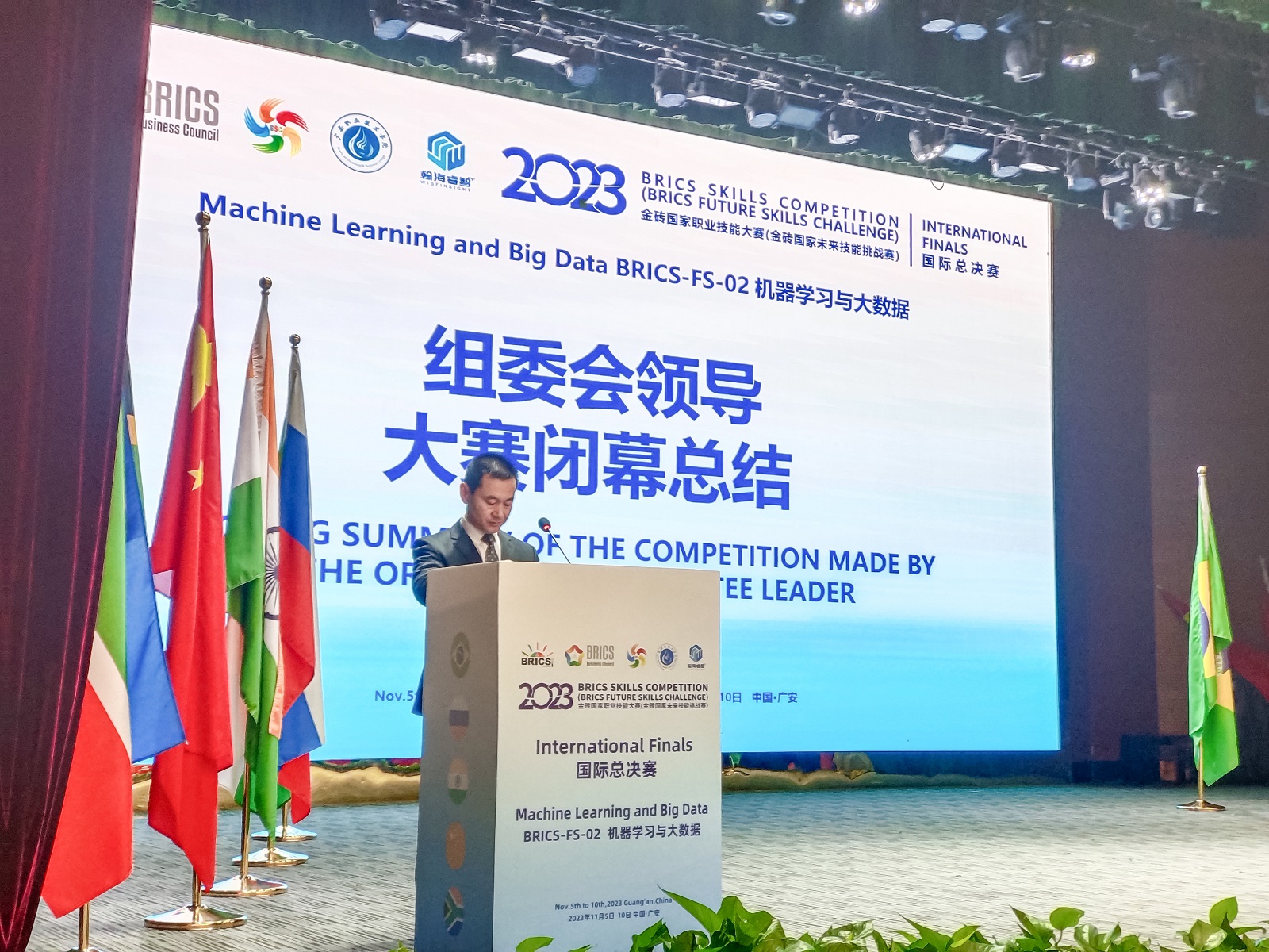 最后,袁驰副校长再次向所有的参赛选手表示最真挚的祝贺和感谢,并宣布2023金砖国家职业技能大赛机器学习与大数据赛项国际总决赛闭幕!