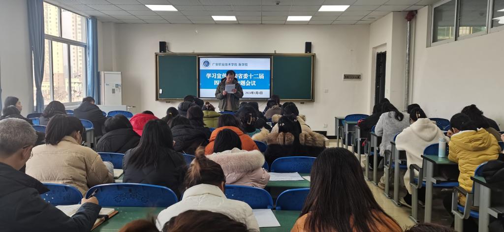 会议强调,要把学习宣传贯彻省委十二届四次全会精神作为当前和今后一个时期学院的重要政治任务,对扎实抓好传达学习、宣传宣讲和贯彻落实会议精神提出四点要求。一要充分认识全会的重要意义,切实提高政治站位,用思想自觉引领行动自觉,全院教师党员要进班开展宣讲工作,迅速掀起学习贯彻热潮。二要将贯彻落实全会精神贯彻落实到学院的各项工作中,切实增强责任感、紧迫感和使命感。三要坚持以人民为中心发展教育,加强素质教育。四要充分发挥学院培养医学类专业技能人才优势,助推城乡融合发展和共同繁荣,更好服务于教育强国、科技强国和人才强国建设。