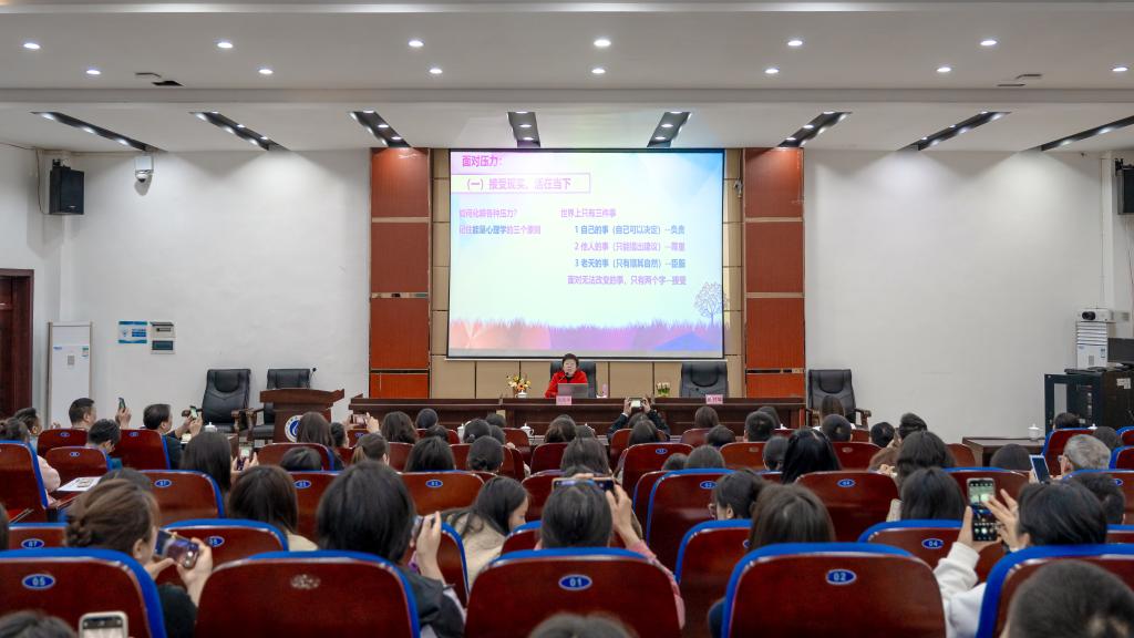为培育教职工积极阳光、乐观自信的工作心态,调解职场及生活压力,关心关爱教职工心理健康,4月9日下午,医学院邀请经济学博士、教授,国家注册心理咨询师,原广安市副市长,原四川开放大学副校长,四川省“三八红旗手”吴兆华在先圣厅举行了“‘快乐工作、幸福生活’职场人员心理健康与压力调适”专题讲座。医学院全体教职工,校属各单位、各二级学院部分教职工,附属医院部分职工共200余人聆听了讲座,讲座由医学院院长杨书琴主持。