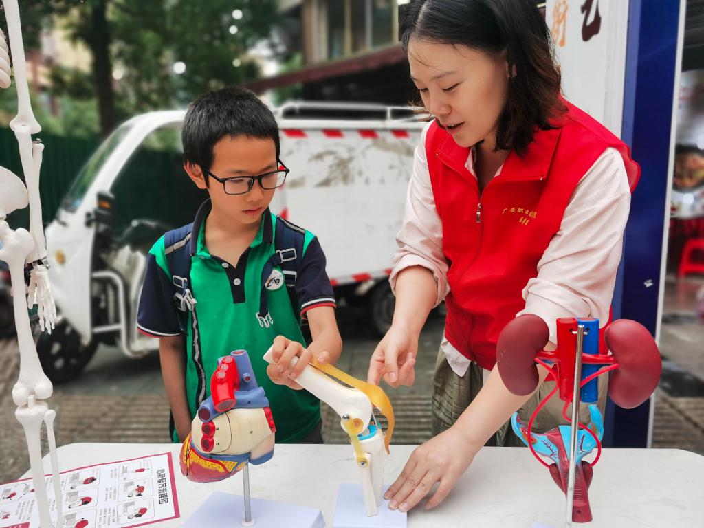 本次活动设置了人体解剖模型展示区、心肺复苏体验区、医学知识讲解答疑区,吸引了大批居民参与。医学科普教育基地的老师们通过展示人体结构模型为居民讲解人体结构,普及生命科学知识。心肺复苏体验区的老师为大家演示心肺复苏操作要点,并现场邀请居民操作,提升居民的应急救护技能,同时发放“预防脑卒中”“睡眠管理”“健康生活小知识”等宣传册,为居民讲解答疑,传递科学的健康生活理念。
