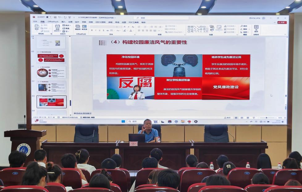 6月19日,学校第八期“青马班”在希贤厅迎来了最后一堂授课。马克思主义学院院长、副教授石乾福以《以党的二十大精神为指引—争做新时代廉洁自律大学生》为题,牢固树立青马学员廉洁自律意识。授课内容既有理论高度,也有实践深度,具有强烈的指导意义和育人价值。他从共产党性质、党风廉政建设与反腐败斗争、大学生廉洁教育等方面进行讲授,结合历史案例,用辩证思维去阐述通俗易懂的道理,青马学员深受启发和警示。