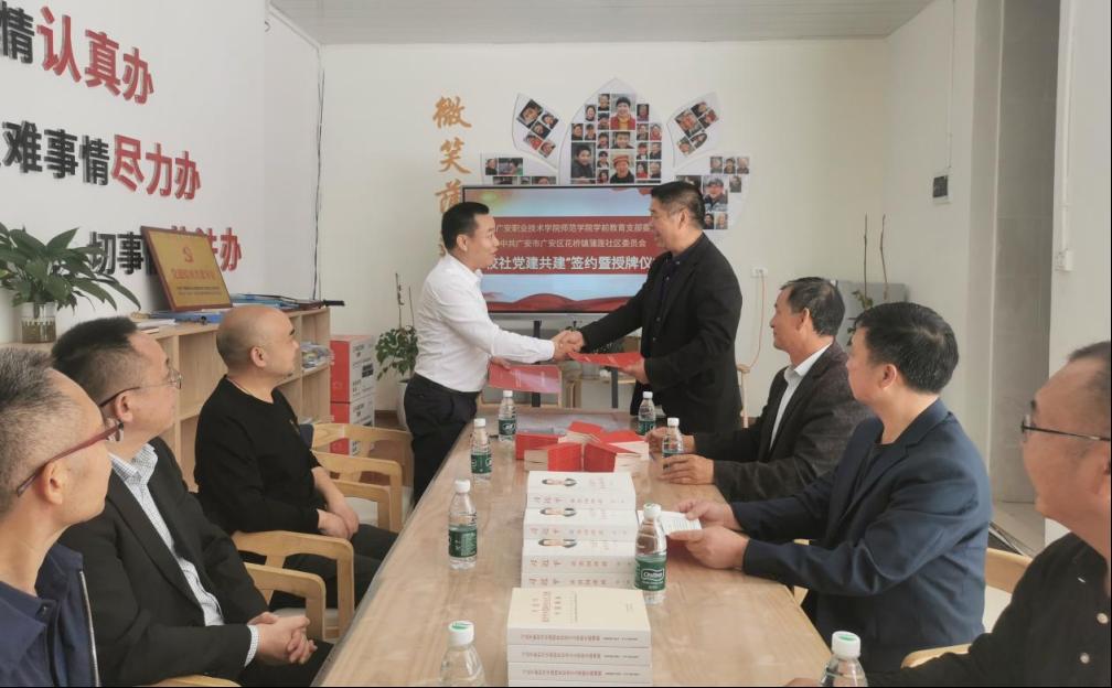 近日,师范学院学前教育党支部一行赴广安区花桥镇蒲莲社区,与花桥镇蒲莲社区党支部签订校社党建共建协议暨授牌仪式。学校党委委员、副校长冉嘉洛,师范学院党总支书记彭松林、党总支副书记牛振宇、花桥镇蒲莲社区党支部书记伍泽孝等出席本次活动。