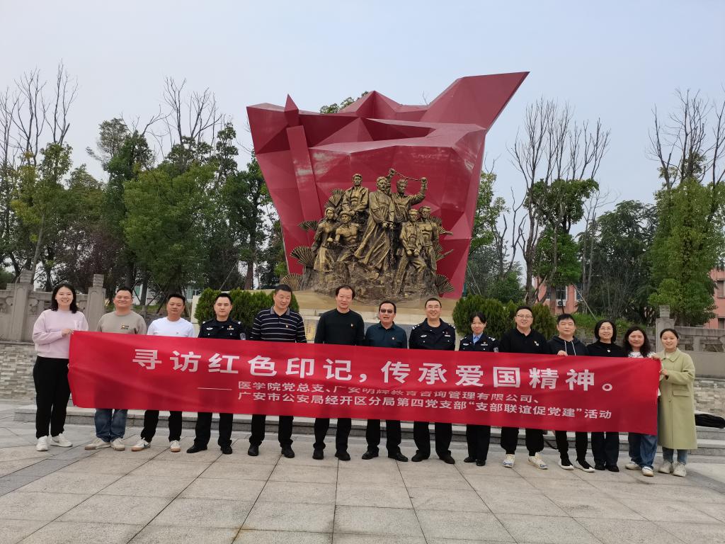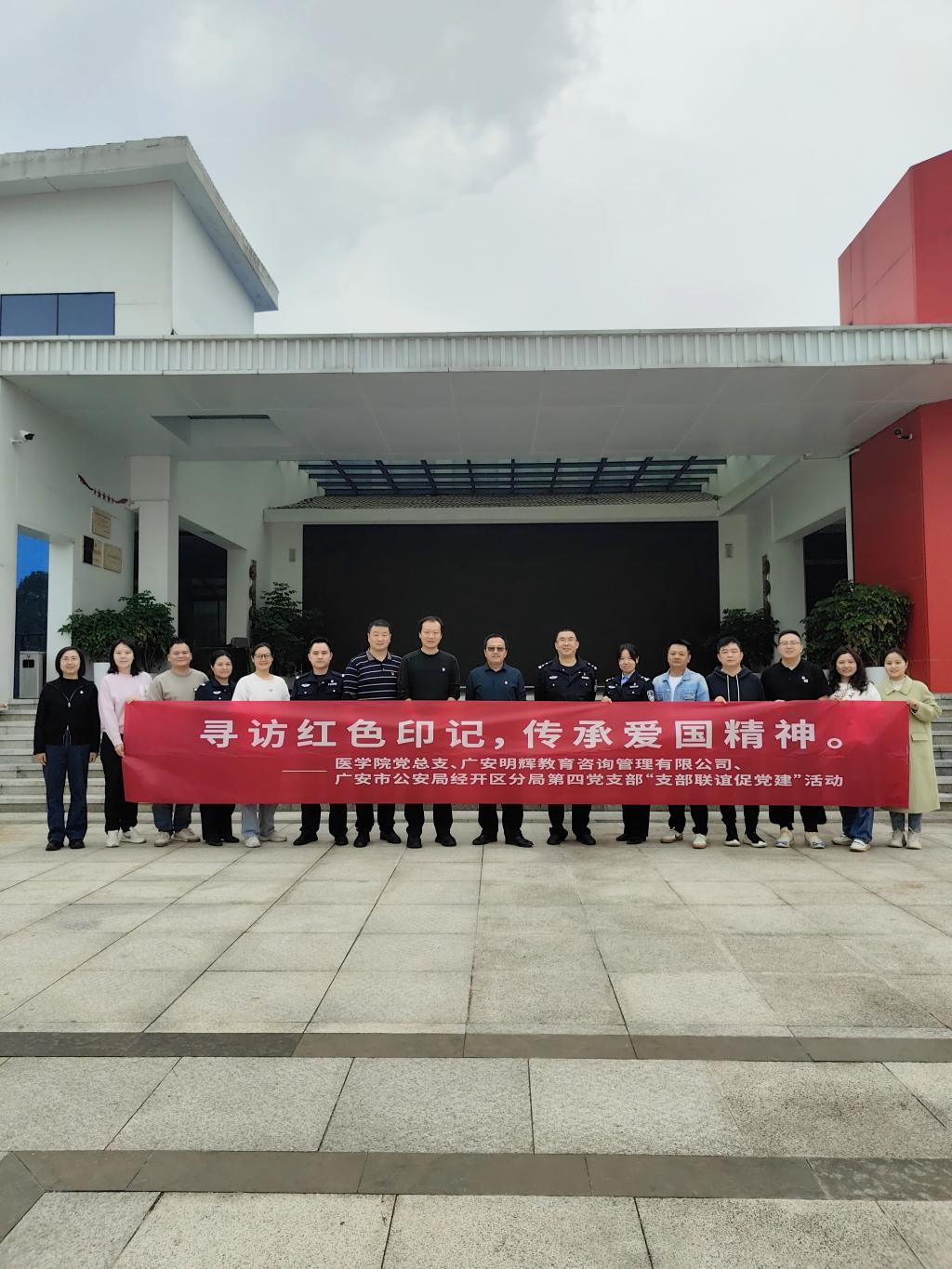 为深入贯彻党的二十届三中全会、省委十二届六次全会精神,加强医学院党总支与广安明辉教育咨询有限公司、广安市公安局经开区分局第四党支部的交流联系,引导全体党员进一步树立党建意识,11月8日,医学院党总支与广安明辉教育咨询有限公司、广安市公安局经开区分局第四党支部赴武胜县红色文化园开展“支部联谊促党建”党性教育及主题党日活动。