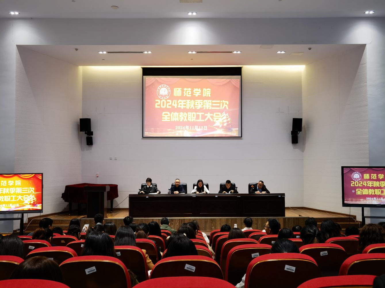 11月12日下午,师范学院在岳秀楼翔凤厅召开了2024年秋季学期第三次全体教职工大会,部署后期重点工作,学院全体教职工参加了会议。院长杨英主持会议并作总结讲话。