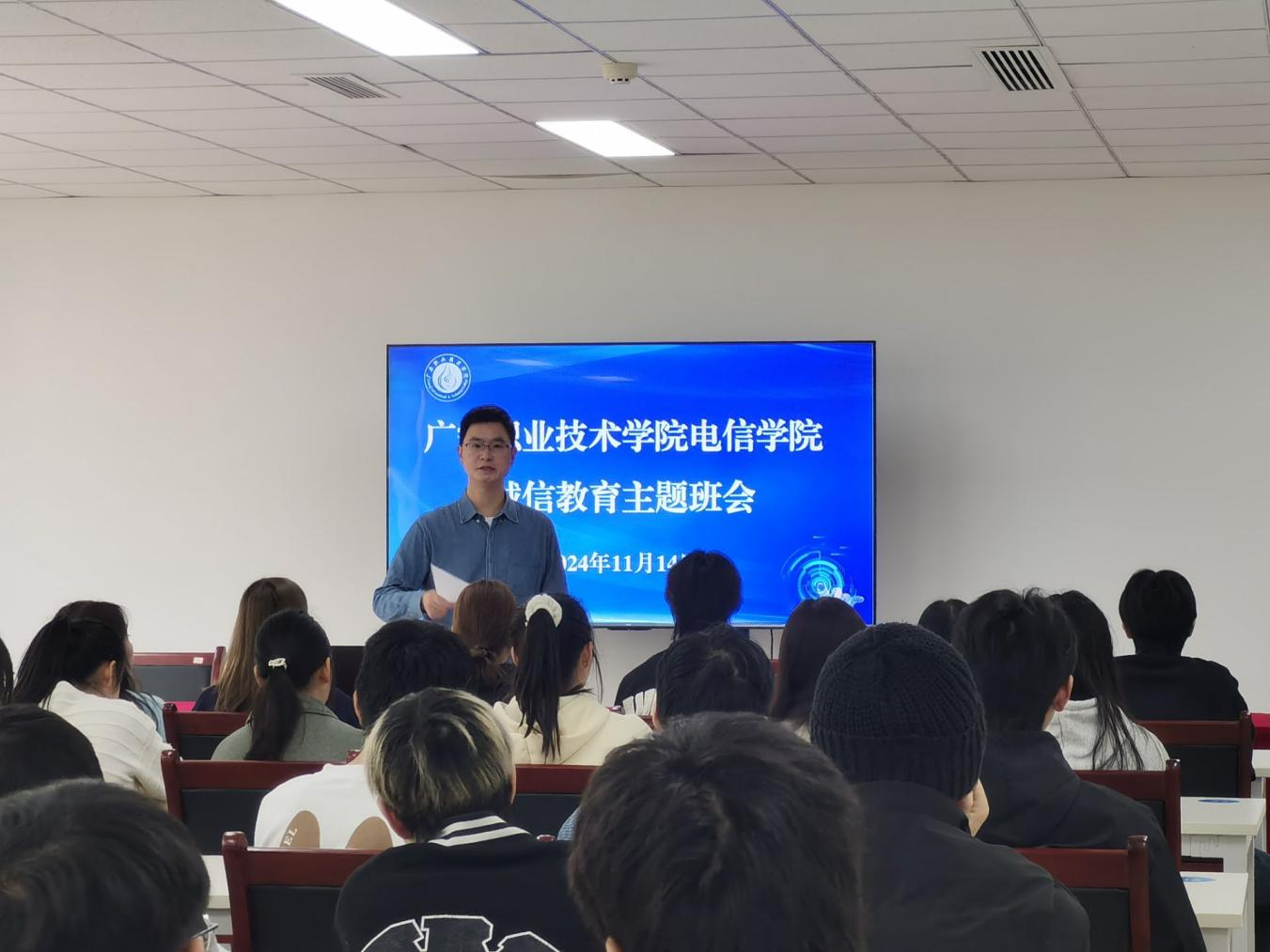 11月14日中午,电信学院组织开展诚信教育主题班会,教育引导学生坚定马克思主义信仰、中国特色社会主义信念、中华民族伟大复兴信心,立报国强国大志向、做挺膺担当奋斗者,会议由电信学院党总支书记张义桥主持。