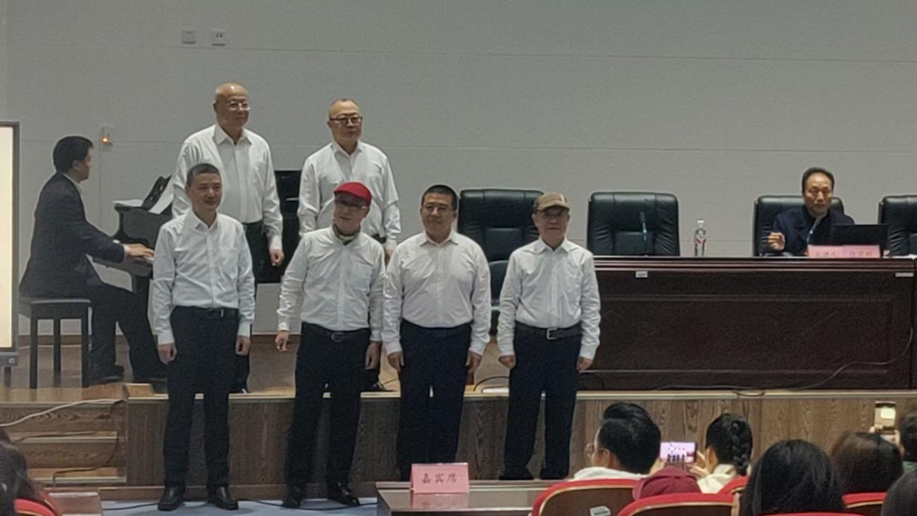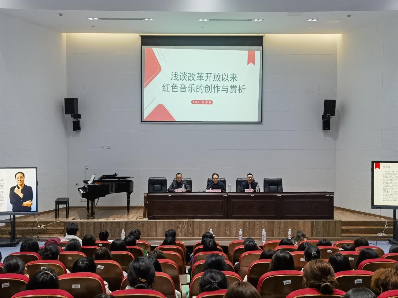 红色音乐作为红色文化的重要组成部分,不仅承载了党和人民共同奋斗的历史记忆,更以其独特的艺术魅力,激励着人们不断前行。在两个多小时的讲座中,张教授为听众们深入浅出地剖析了改革开放以来红色音乐的创作背景、艺术特色以及赏析方法。从《春天的故事》到《走进新时代》,一首首耳熟能详的红色经典,如同历史的见证者,诉说着时代的变迁与人民的心声。在阐述红色音乐的创作特点时,他着重围绕红色音乐在创作上始终坚持“以人民为中心”的艺术导向,注重从人民生活中汲取灵感,用朴实无华的语言和真挚动人的旋律,表达人民群众对美好生活的向往和追求展开。同时,对红色音乐在旋律、节奏、和声等方面进行大胆创新与尝试,使其既具有鲜明的时代特色,又不失民族韵味等方面选取了多首具有代表性的红色音乐作品进行逐一剖析。他通过讲解作品案例、播放音视频、展示乐谱、解析创作背景以及邀请嘉宾现场个人演唱、小组展演等方式,引导听众们从多个角度去感受和理解这些红色音乐作品所蕴含的思想内涵和艺术价值。其中,张教授创作的《峥嵘岁月》《人民如山》《中国步伐》等激昂的旋律和深情的歌词,让在场的每一个人都为之动容,仿佛置身于激情燃烧的岁月。最后,张教授还就如何更好地传承和发扬红色音乐提出了自己的见解和建议。他鼓励大家要用心去感受红色音乐的魅力,用实际行动去传承和发扬红色文化,为实现中华民族伟大复兴的中国梦贡献自己的力量。