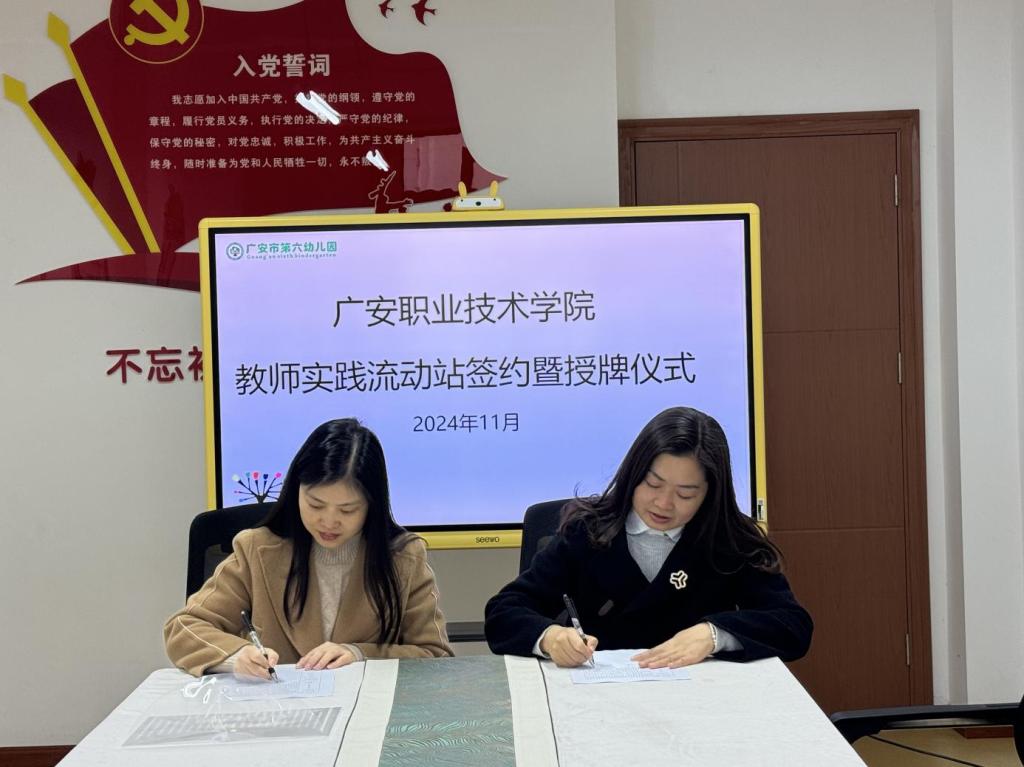 为进一步深化院园融合、拓宽教师专业实践平台,推进学前教育省级高水平专业群高质量发展,11月26日,师范学院院长杨英一行前往广安市第五幼儿园、广安市第六幼儿园两所附属幼儿园调研并举行教师实践流动站签约授牌仪式,附属幼儿园园长及相关行政人员参加了此次签约授牌仪式。