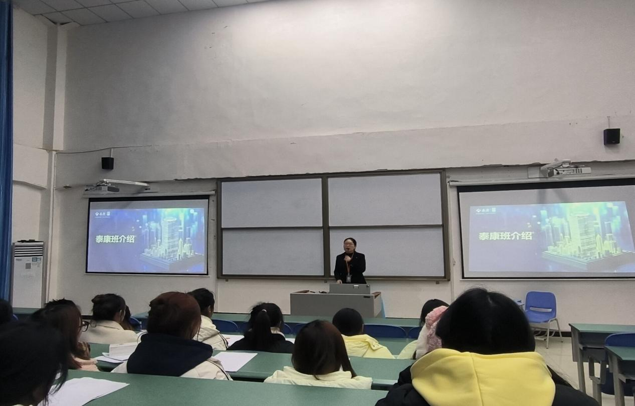 12月17日,泰康之家蜀园成都健康服务有限公司人事部经理姜虹羽一行来到医学院针对学院医卫类专业开展专场招聘宣讲活动。宣讲会在崇贤楼A阶1-1教室进行,医学院校企合作与招生就业科相关人员、智慧健康养老服务与管理专业辅导员及2023级智慧健康养老服务与管理专业学生参加了此次宣讲。