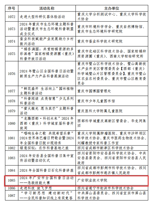 近日,中国科协办公厅印发《中国科协办公厅关于对2024年全国科普日有关组织单位和活动予以表扬的通知》,学校医学院开展的“2024年广安市全国科普日活动——急救技能竞赛”被评为2024年全国优秀科普日活动。