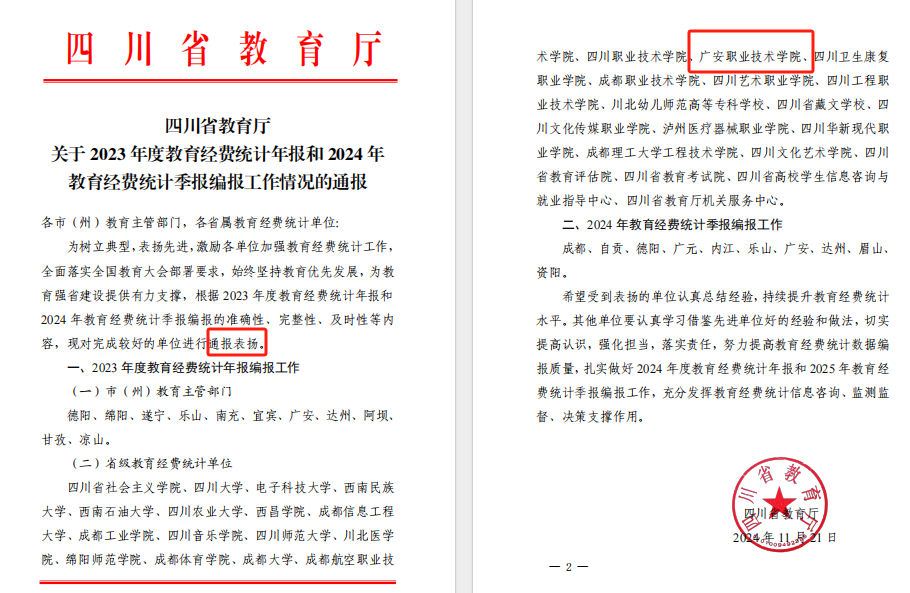 11月21日,四川省教育厅发布《关于2023年度教育经费统计年报和2024年教育经费统计季报编报工作情况的通报》,伟德荣获通报表扬。