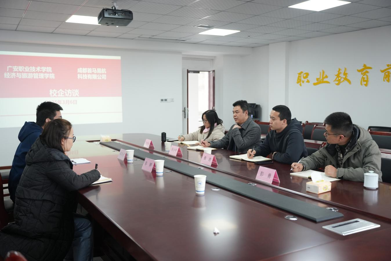 3月6日,成都首马易航科技有限公司总经理陈岛子一行赴我院开展校企合作交流活动。经济与旅游管理学院党总支书记吴小平、副院长张浩及教师代表沈婷婷、彭勇参与座谈。
