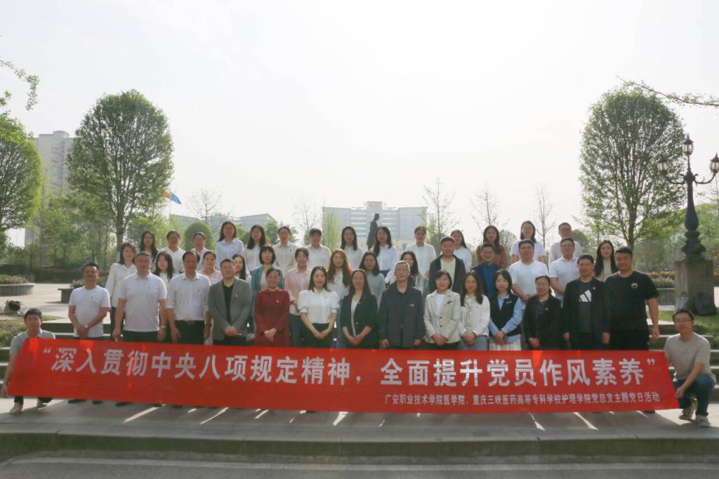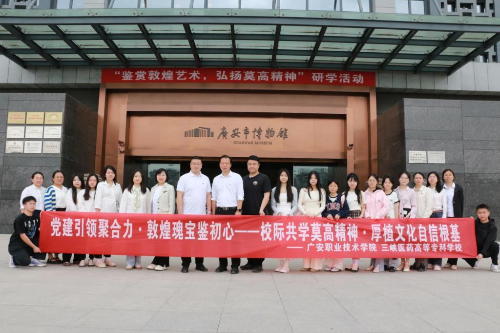 4月15日上午,党建交流与专业建设活动在医学院党总支书记喻忠和院长杨书琴的分别牵头下同步展开。喻忠以《锲而不舍学习贯彻中央八项规定精神》为题讲授专题党课,着重强调作风建设在育人工作里的关键作用。紧接着,两校围绕基层党组织建设、思政教育创新展开党建工作座谈,针对学生管理中的共性问题分享经验。随后,双方党员代表前往广安市博物馆,开展“党建引领聚合力・敦煌瑰宝鉴初心”主题党日活动。通过观摩敦煌艺术特展,党员们学习“坚守大漠、甘于奉献、勇于担当、开拓进取”的莫高精神,厚植文化自信,凝聚起协同发展的共识。