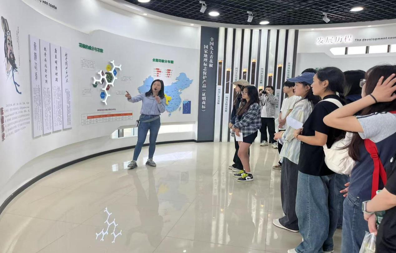 师生团队首先参观了青花椒产业博览园,系统学习了青花椒全产业链发展模式,包括品种选育、标准化种植、精深加工工艺及多元化营销渠道建设。在参观过程中,团队重点分析了电商平台在农产品上行中的关键作用,深入了解了电商如何助力农产品走出乡村、走向市场。